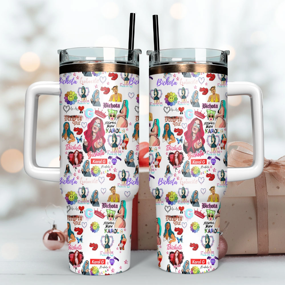 Karol G Singer Anime Custom Quencher 30oz or 40oz Stainless Steel Tumbler With Handle, Best gifts for Friend Family NVA